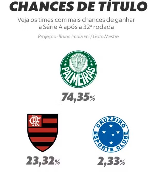 A 32ª rodada do Campeonato Brasileiro foi perfeita para o líder Palmeiras. A vitória tranquila no clássico contra o Santos garantiu subida nas chances de título de 64,27% para 74,35% sem contar os três pontos de vantagem em relação ao vice-líder Flamengo. Os rubro-negros tropeçaram na Vila Belmiro ao permitir o empate do São Paulo por 2 a 2 depois de virar o jogo. Com o resultado, o Fla viu sua possibilidade de ser campeão cair de 34,11% a 23,32%.