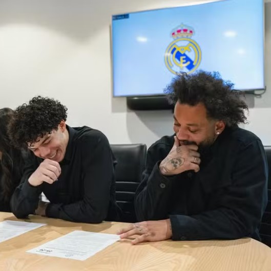 O atacante Enzo Alves, filho do ex-lateral Marcelo, assinou nesta segunda-feira seu primeiro contrato profissional com o Real Madrid. O jogador de 16 anos registrou em suas redes sociais o momento ao lado de sua família, no Centro de Treinamento do clube, em Valdebebas, em Madri. Enzo atua nas categorias de base do time espanhol e integra as seleções de base da Espanha.