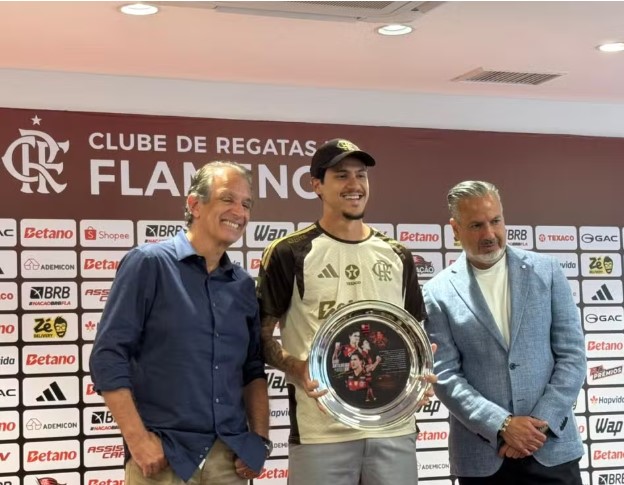 O Flamengo fez uma homenagem a Pedro na reapresentação do elenco, nesta terça-feira, no Ninho do Urubu. O atacante recebeu uma placa das mãos do presidente Bap e do diretor de futebol José Boto, depois de se tornar o maior artilheiro rubro-negro no século com os gols sobre o Fluminense.