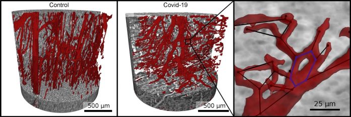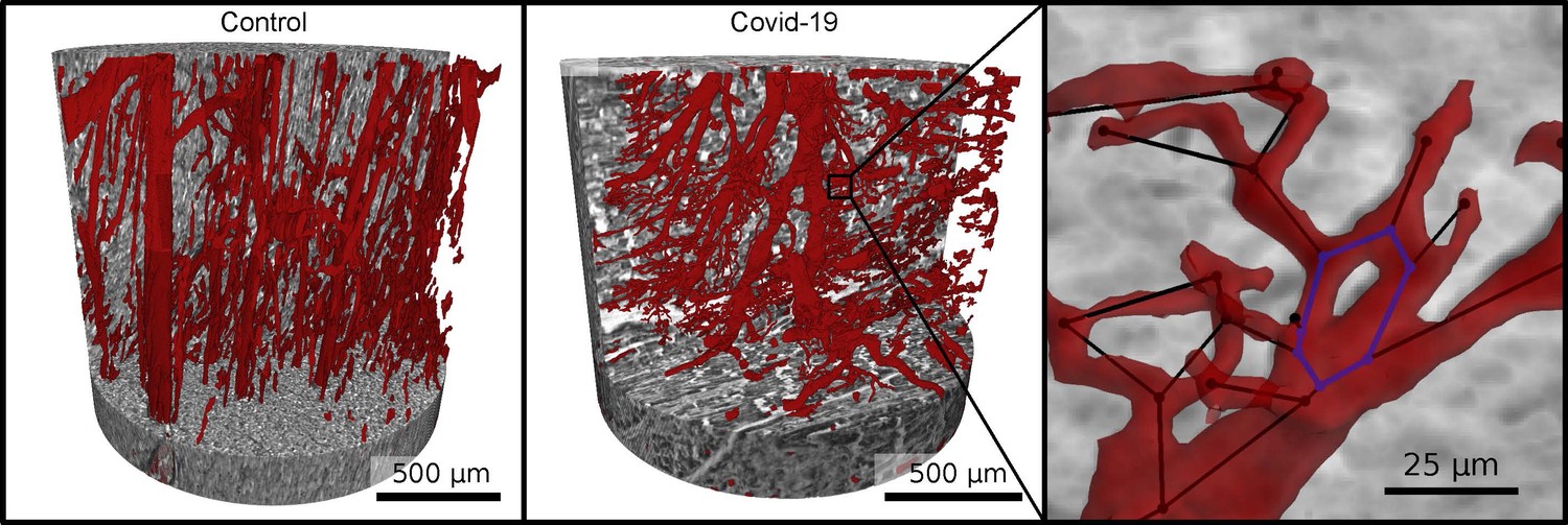 As imagens raio-X geradas revelaram que a Covid-19 impactou profundamente o tecido cardíaco daquelas pessoas a nível microscópico, especialmente os capilares – menores vasos sanguíneos do corpo. Em comparação com os tecidos de um coração saudável, os de pessoas que tiveram formas graves da doença apresentavam inúmeras rachaduras, ramificações e nós causados pela formação de novos capilares.