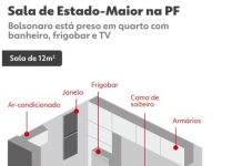Atualmente, Bolsonaro está na Superintendência da Polícia Federal em Brasília, em uma sala de cerca de 12 metros quadrados, com cama de solteiro, banheiro, TV e ar-condicionado.