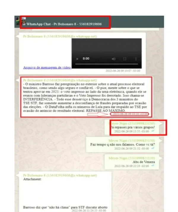 Na investigação sobre um grupo de empresários que discutiram, pelo WhatsApp, um golpe de estado, a Polícia Federal encontrou uma mensagem do contato “PR Bolsonaro 8” que ataca, sem provas, o Tribunal Superior Eleitoral (TSE), o Supremo Tribunal Federal (STF) e o instituto de pesquisa Datafolha.