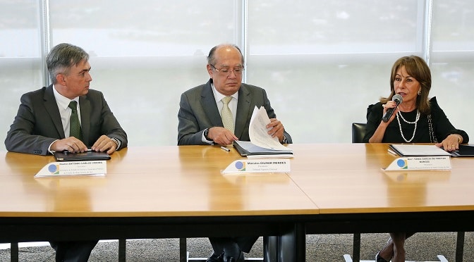O convênio foi assinado pelo presidente do TSE, ministro Gilmar Mendes, pela presidente do TRE-MS, desembargadora Tânia Garcia de Freitas Borges, e pelo secretário de Estado de Justiça e Segurança Pública, Antonio Carlos Videira, que representou o governador Reinaldo Azambuja.