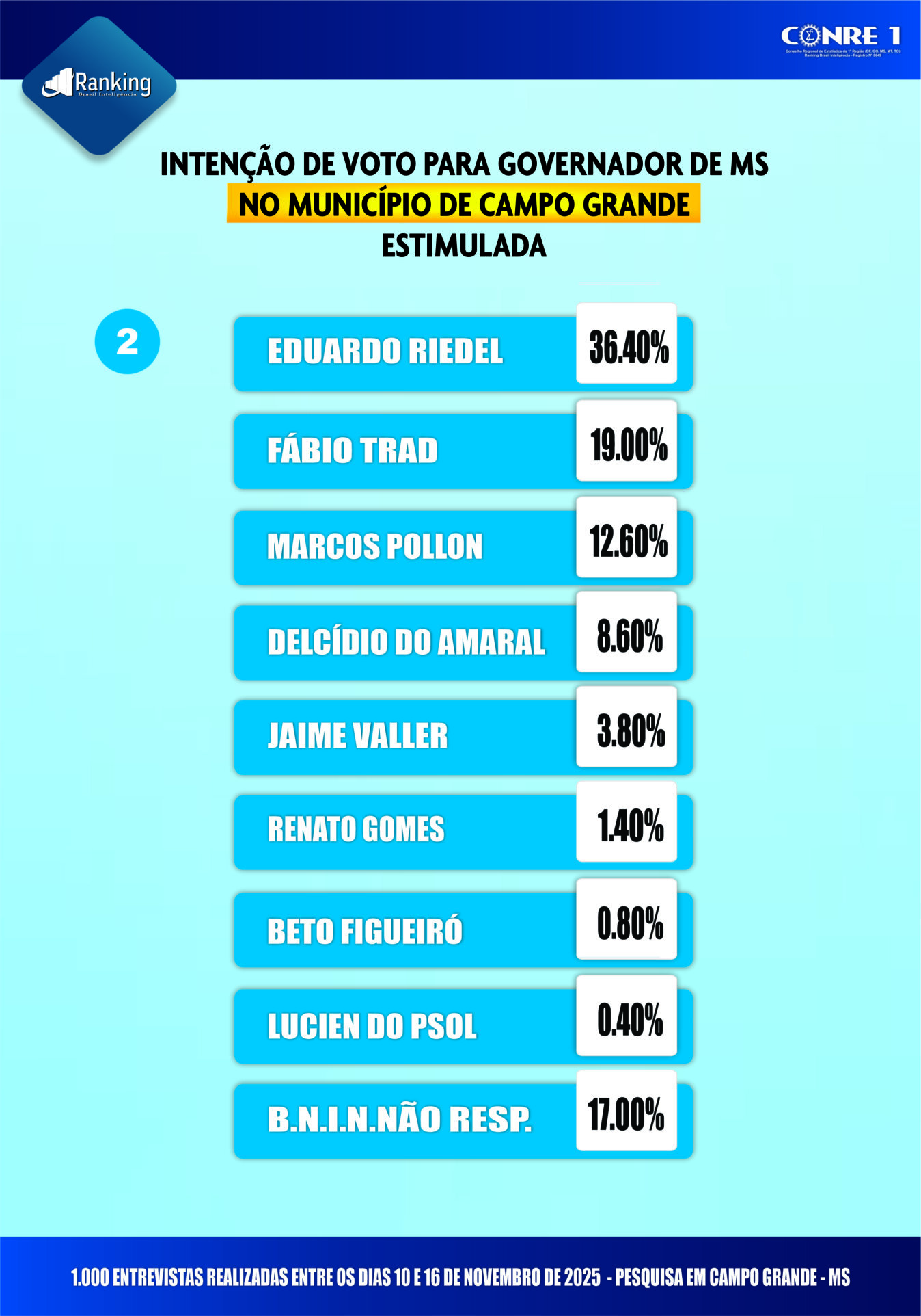 Por encomenda da Rede de Rádios Top FM, a primeira pesquisa realizada pelo Instituto Ranking Brasil Inteligência, de 10 a 16 de novembro deste ano, junto a 1.000 eleitores, com 16 anos ou mais de idade, nas sete regiões urbanas de Campo Grande (MS) e nos distritos de Anhandui, Rochedinho e zona rural, com intervalo de confiança de 95% e margem de erro de 3 pontos percentuais para mais ou para menos, traz a intenções de votos para governador de Mato Grosso do Sul.