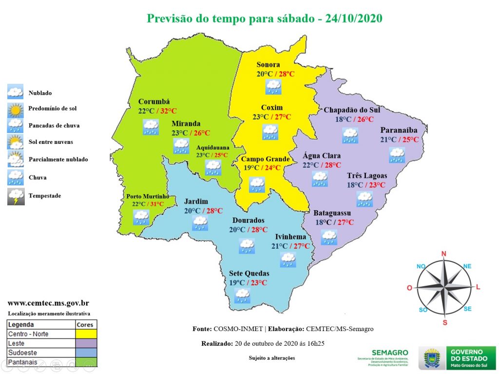 Tendência de precipitação emitida pelo Cemtec indica que nos últimos dias do mês de outubro as chuvas continuam a ocorrer em todas as áreas do Estado. Os acumulados poderão ser mais altos e mais intensos nos dias nos dias 26, 27, 29 e 30 de outubro, especialmente as regiões sudoeste, sul, central e bolsão. O volume de chuva estimado para essas áreas varia entre 80 a 100 milímetros. Já nas regiões norte e pantaneira são esperadas acumulados entre 40 a 70 milímetros.